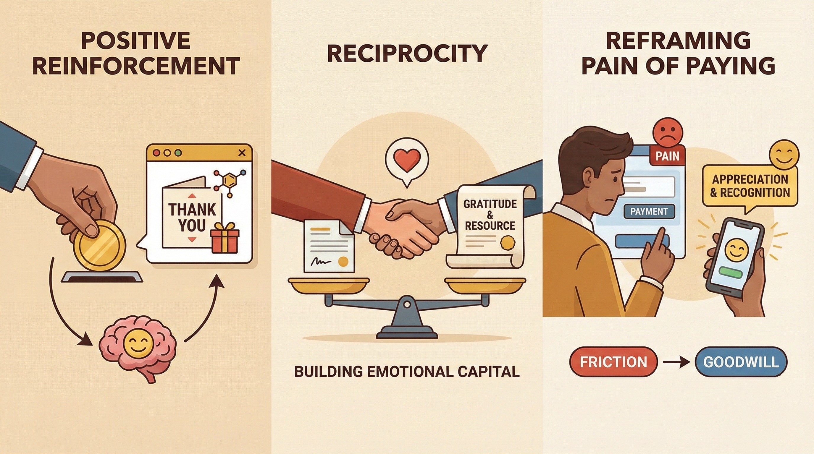 Psychologists describe the “pain of paying”, a moment of friction during any transaction. This is heightened in B2B contexts where payment comes after value is already delivered. This is heightened in B2B contexts where payment comes after value is already delivered. By adding recognition to that moment, rather than silence, you reduce the emotional discomfort.