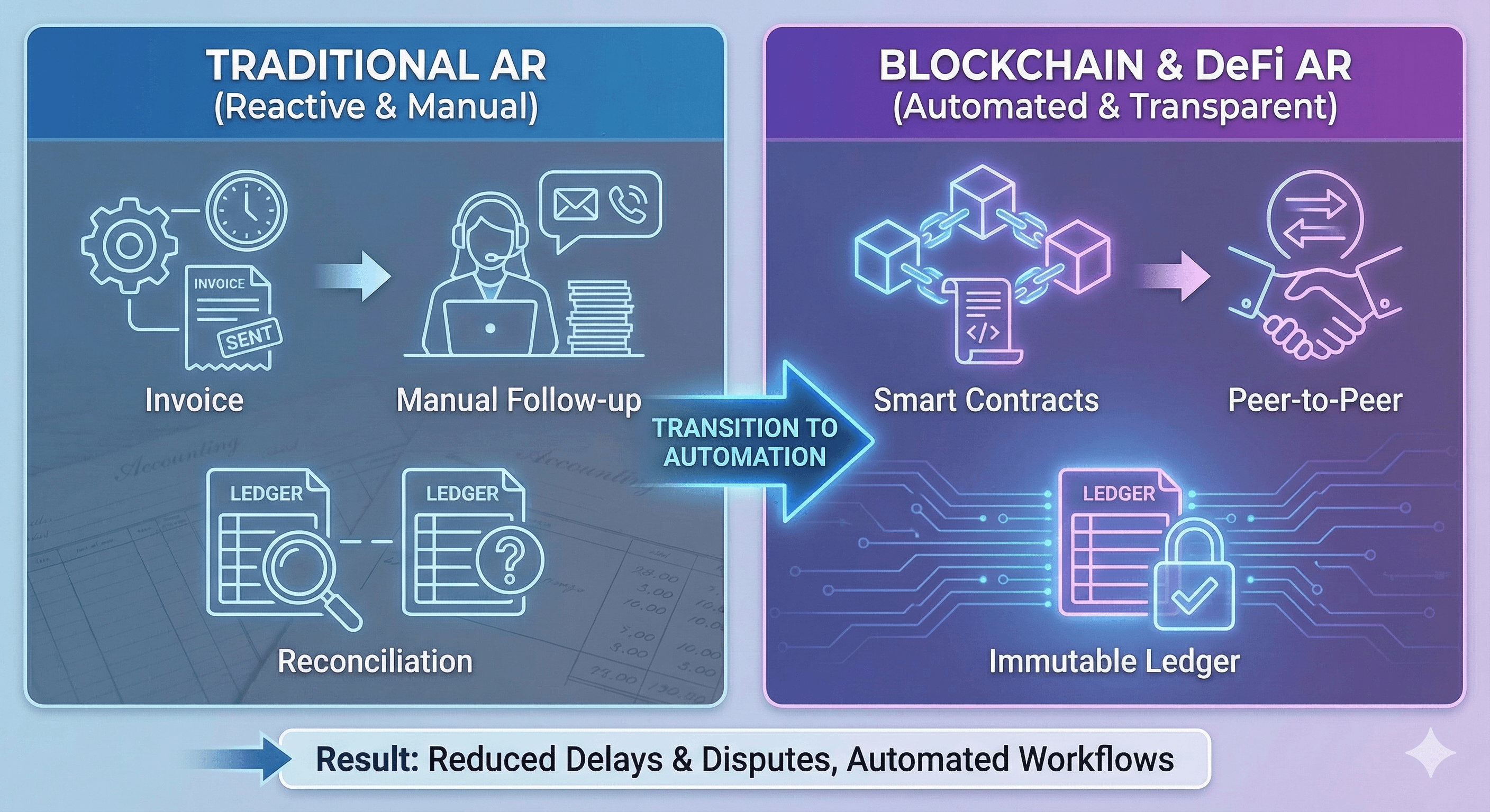 Blockchain introduces programmable payments, shared ledgers, and faster settlement that could reshape AR over time.