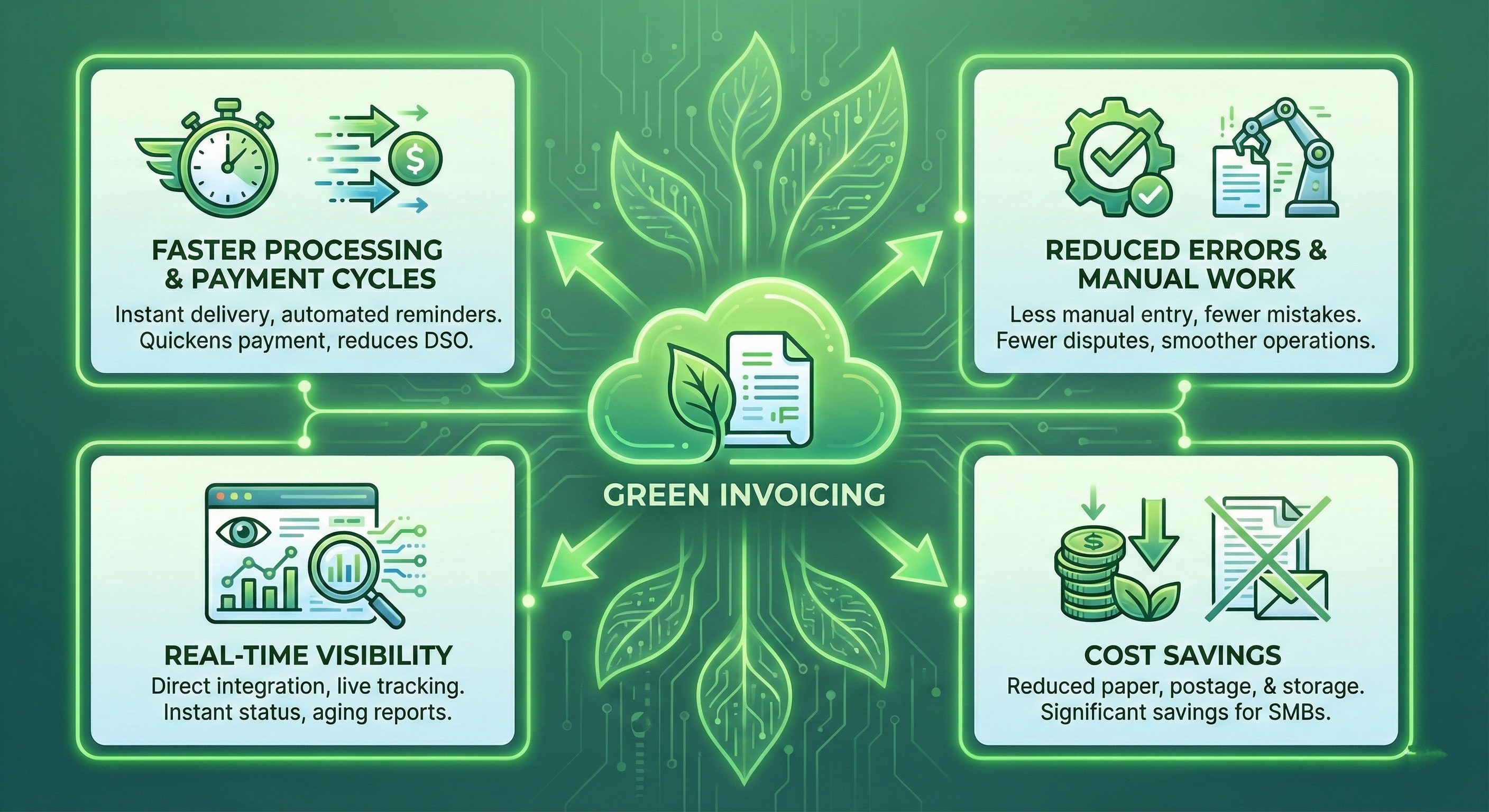 While sustainability is a core motivation for green invoicing, it also reduces costs tied to paper, postage, handling, and storage. These savings can be significant, particularly for SMBs issuing large volumes of invoices.