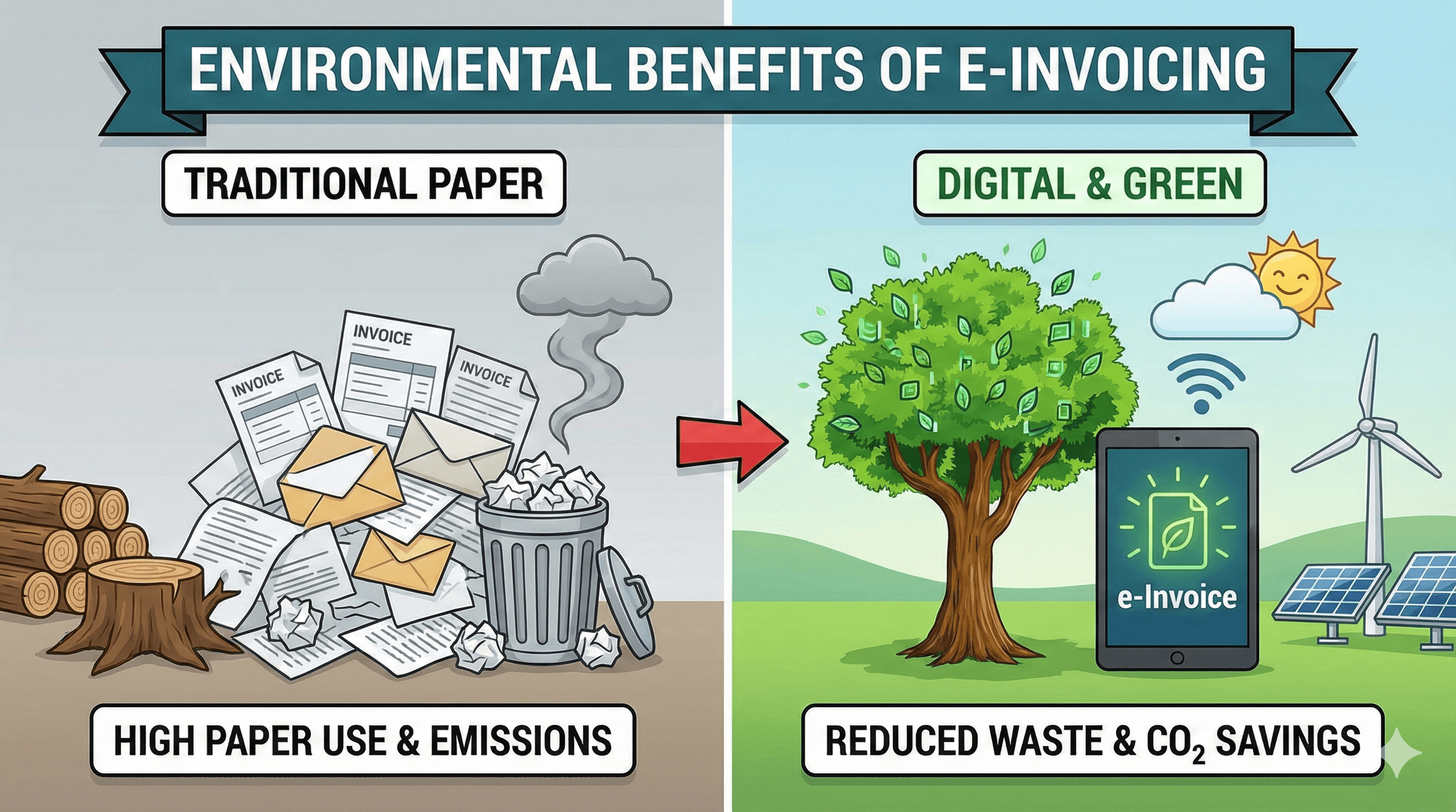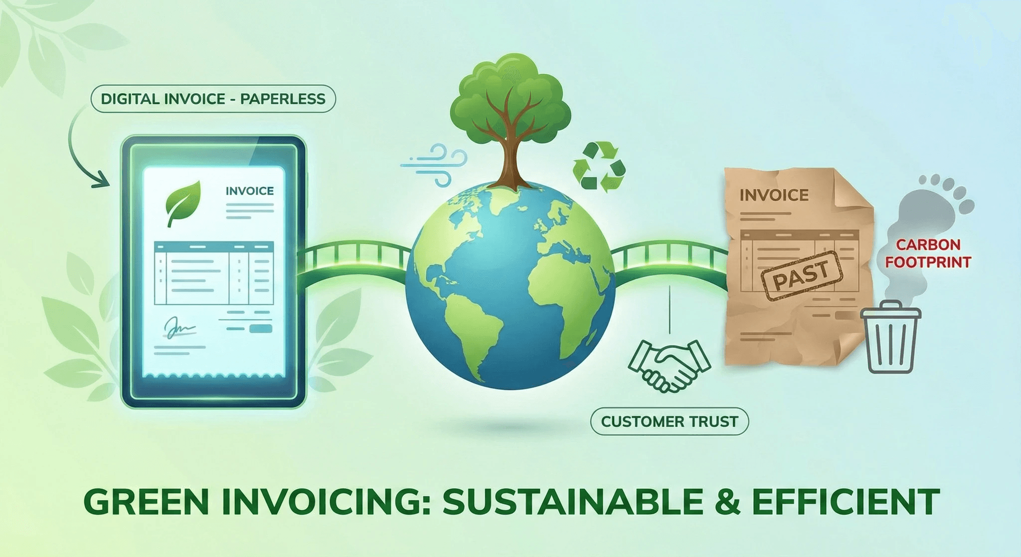 Green invoicing dramatically reduces paper waste and contributes to lower carbon emissions compared to traditional invoicing.