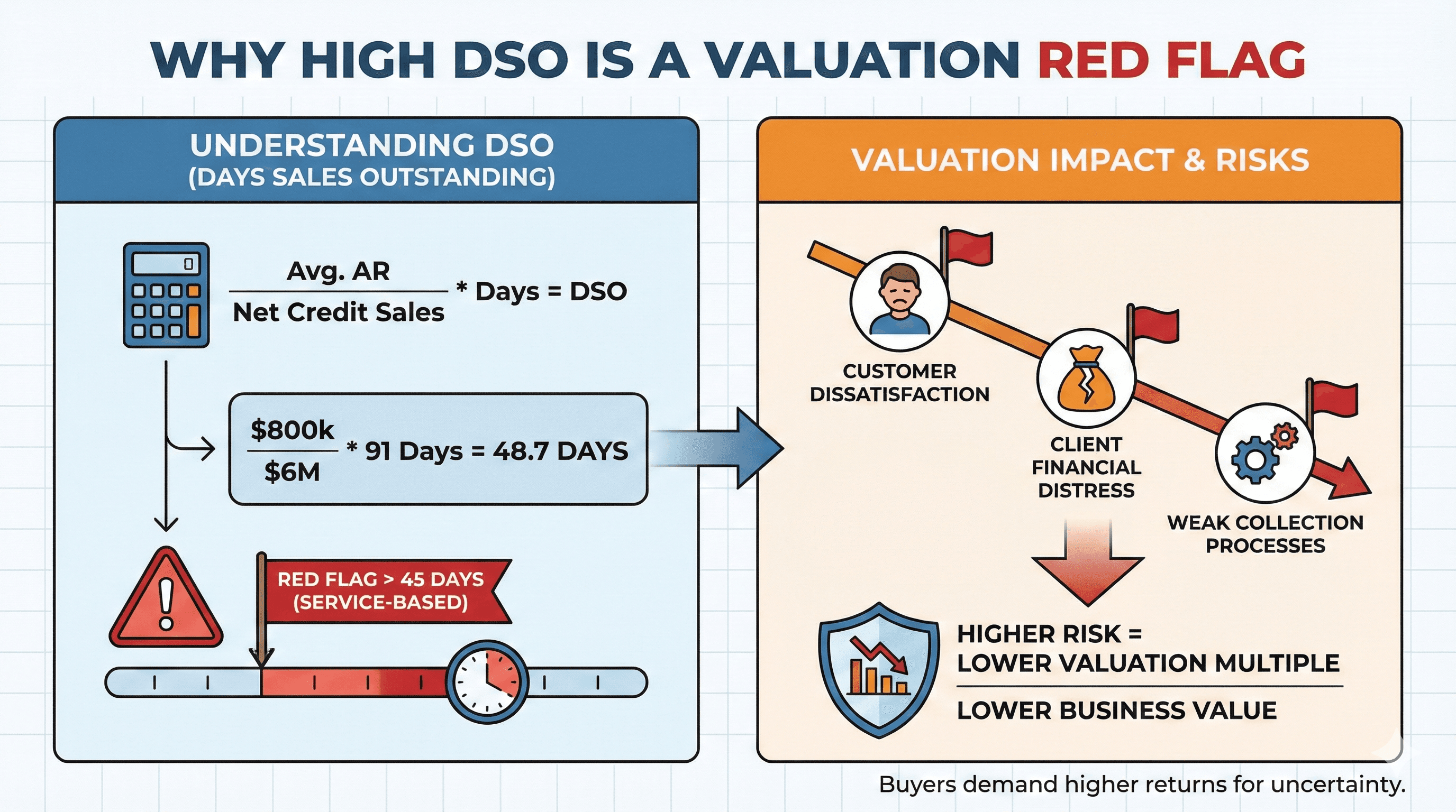 Investors and valuation analysts treat DSO as a primary indicator of operational health. A climbing DSO suggests customers are paying slower, which may indicate customer dissatisfaction, financial distress among clients, or weak internal collection processes. Each of these interpretations raises the risk profile of your business. Higher risk translates directly into a lower valuation multiple, because buyers demand higher returns to compensate for uncertainty.